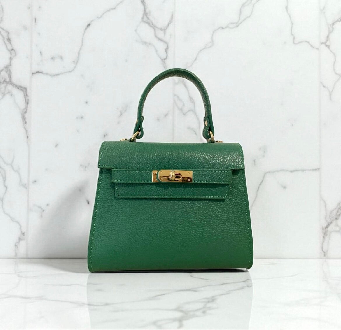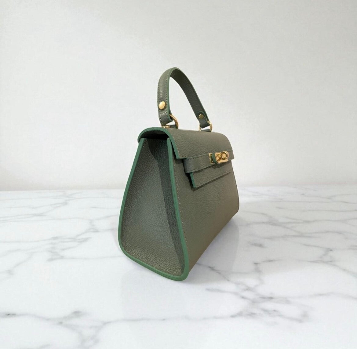 La borsa Grace è un omaggio alla raffinatezza italiana: realizzata a mano in pelle pieno fiore, si distingue per la sua silhouette strutturata, il manico rigido e la chiusura dorata che aggiunge un tocco di luce. Il verde intenso, ispirato ai paesaggi del Garda, dona carattere e versatilità, perfetta sia per il giorno che per la sera.